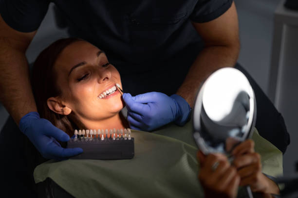 A beautiful young patient uses a dental tooth shade guide for whitening teeth service to ensure a perfect choice of color. Bleaching, prosthetics, orthopedic dentistry concept.